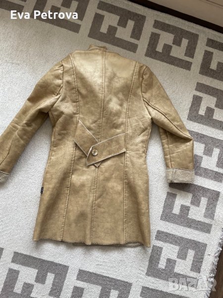 Дамско манто от агнешка кожа отвън,отвътре хастара е пухен,топли ужасно многоп ,в бежов нюанс .Липсва едно копче ,изгубих го -показала съм на снимката,отговаря на С,М.Купувано за над 200лв.