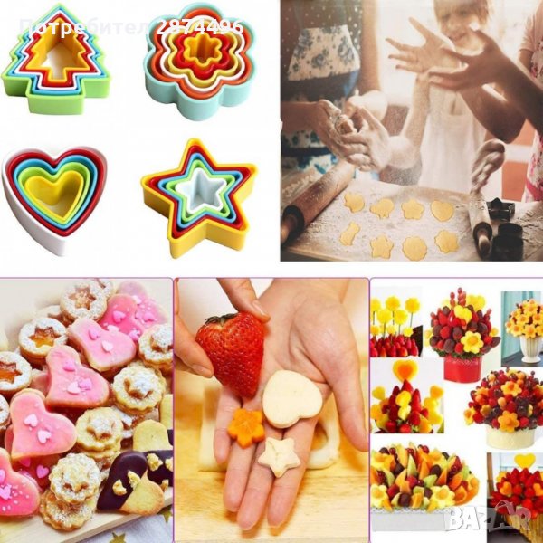 Комплект форми за дребни сладки с форма по ваш избор в пет размера. Пластмасови форми за рязане на тесто и оформяне на дребни сладки курабии, меденки, бисквити. Формичките са в комплект от 5 броя с форма на звезда, сърце, елха , кръг или квадрат, като всички са с различен размер и цвят. Цветовете се изпращат на случаен принцип.