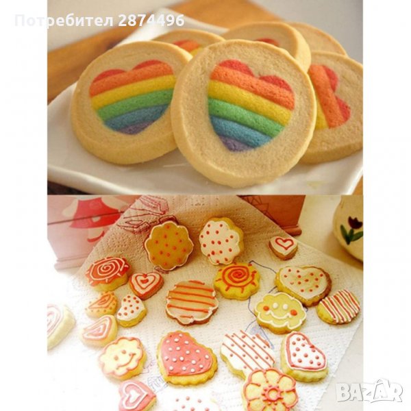 Пластмасови форми за рязане на тесто и оформяне на дребни сладки курабии, меденки, бисквити. Формичките са в комплект от 5 броя с форма на цвете, като всички са с различен размер и цвят.