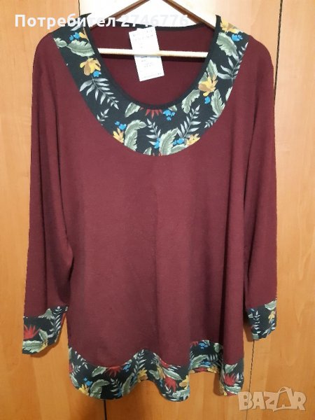 Ново!Размер 56-3xl Прекрасна туника в Бордо с цветна украса,от Кашмирено трико,еластична,бг производство,Мерки без разтягане:гръдна об.-130,ханш-136,дължина-80 Изпращам с преглед и тест по Еконт!