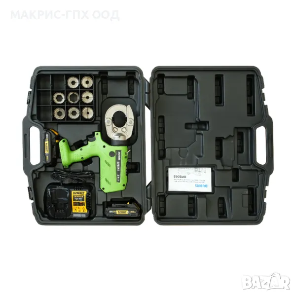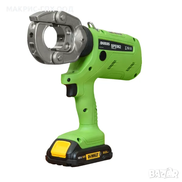 Професионална акумулаторна преса за кербоване на кабелни обувки и съединители, С-клеми и окръгляне на проводници. Хидравличният инструмент е снабден с въртяща се на 340° за максимално удобство, дори в тесни пространства. Производителят е френска компания, дъщерна на американския гигант Stanley Infrastructure.