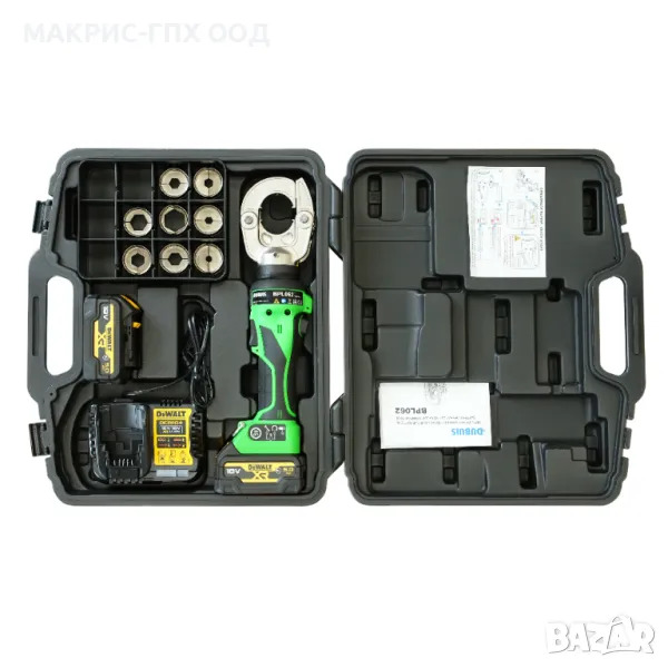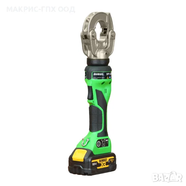 Професионална акумулаторна преса за кербоване на кабелни обувки и съединители, С-клеми и окръгляне на проводници. Хидравличният инструмент е снабден с въртяща се на 180° за максимално удобство, дори в тесни пространства. Производителят е френска компания, дъщерна на американския гигант Stanley Infrastructure.