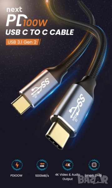 Кабел Type-C към Type-C, USB-C, USB 3.1 Gen2 5A 100W 10Gbps 4K + Гаранция