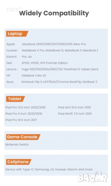Поддържа: бързо зареждане 100W PD (20V/5A)