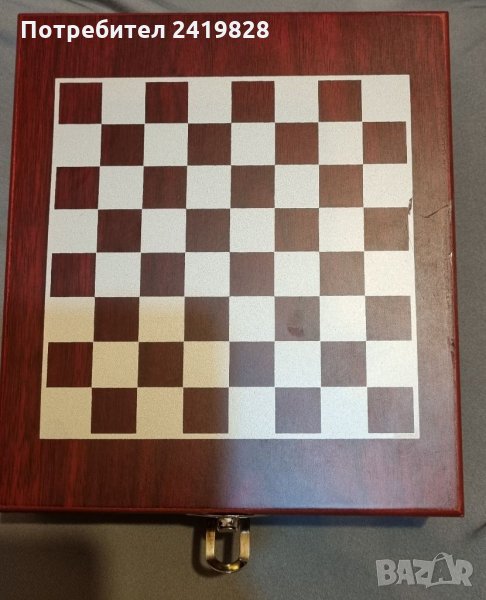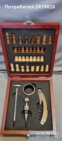 Комплект за вино в луксозна дървена подаръчна кутия. Комплекта включва шах, тирбушон, термометър, тапа и капкоуловител. Мострен продукт