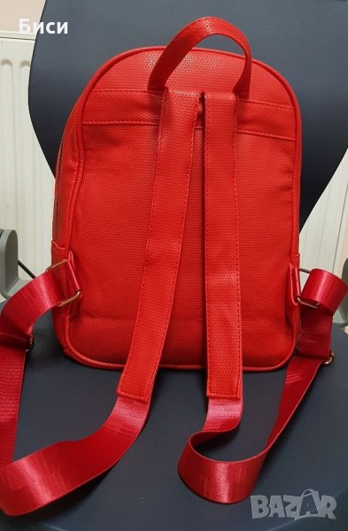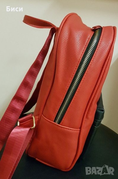 Практична средно голяма маркова раница от естествена кожа.Нова ,неносена.,червена на цвят ,розовоцикламени дръжки,златисти метални елементи.Не е купувана от БГ.