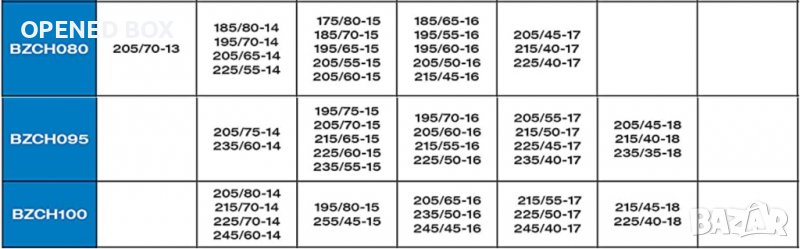 Тази специална снежна верига е подходяща за следните размери на гуми:
