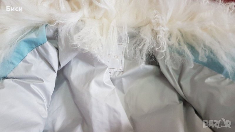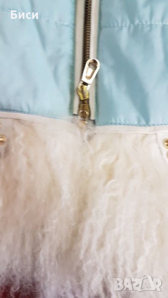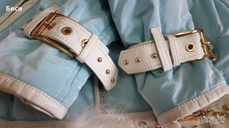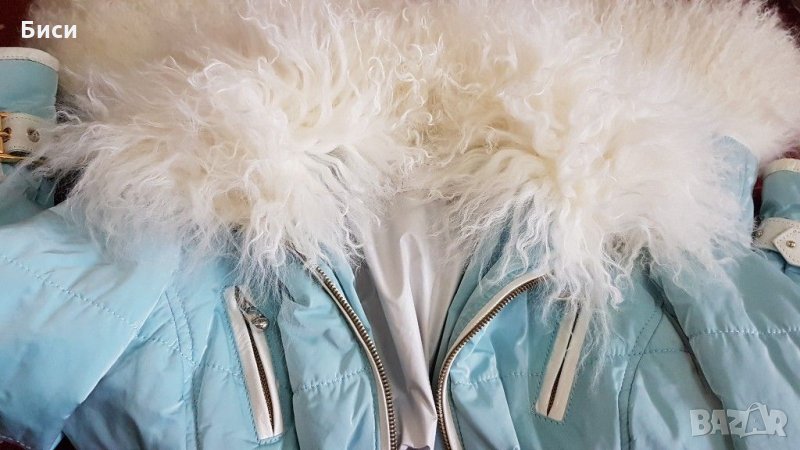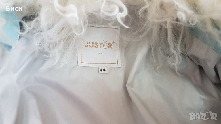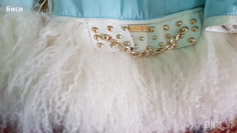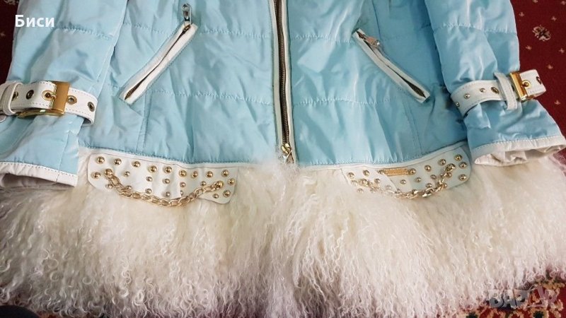 Бутиково италианско много красиво яке,вталяващ фигурата модел.Непромокаема фина леко лъскава материя в съчетание с естествена бяла кожа ,богат бял косъм от лама,златисти метални елементи.Купувано е скоро за 1200Е от магазин на марката Justor.Размер S/M.