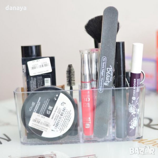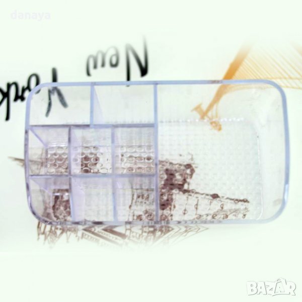 Прозрачен органайзер за козметика и гримове с 9 отделения. Идеален органайзер за червила, четки за грим, спирали, кремове и други козметични аксесоари. Удобен и практичен органайзер, който стои идеално пред огледалото или плътно до стената, тъй като разползага с плосък гръб. Изчистен и семпъл дизайн. Изработен от прозрачен акрил.