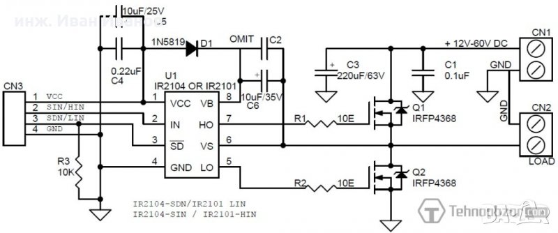 IR2104 MOSFET / IGBT драйвер за мостови и полумостови инвертори