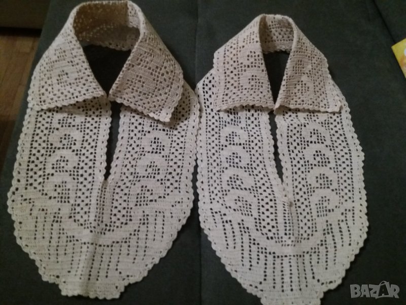 Плетени яки на една кука с памучни конци и колосани. Яките са нови 2 бр. еднакви на цена по 20 лв. всяка. Отговарям на съобщения тук, или на тел. 0887780808, изпращам с куриер или лично предаване в София.