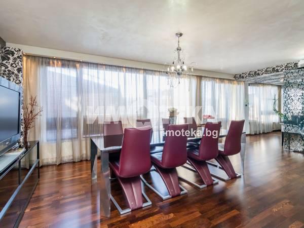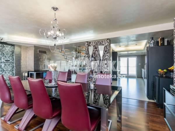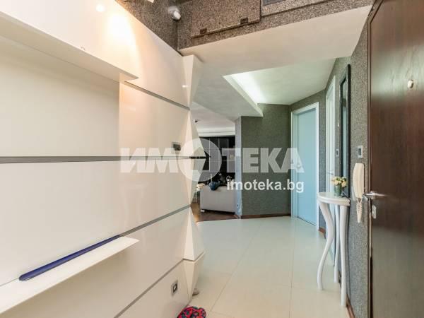 Дизайнерски обзаведен и оборудван мезонет с гледка към морето. Имотът е завършен в последните тенденции на съвременният дизаин. В интериора са използвани висококачествени материали и обзавеждане от най високо качество. Френските прозорци внасят усещане за простор и светлина. Централно отопление, сауна, джакузи, лятна кухня, барбекю , хамак за почивка-Royal Botanik, голяма тераса с покритие от тиково дърво са само част от екстрите в имота. На първото ниво ,са разполижени, входно антре и кът за отдих, просторна дневна, кухненска част с италианска трапезна маса, -Molteni и столове -Senza, още един кът за почивка, две спални, санитарен възел и голяма южна тераса. Родителската спалня ,е отделена от банята и сауната със стъкло ,отделно гардеробната и още една тераса, заемат цялото второ ниво. Заедно с оргиналните авторски идеи за класа на интериора допринасят и прецизно подбраните мебели на ALBERTA SELAMORE U VERRSUS. Таваните във всички стаи са тип-Barisol Апартамента се продава с пълното обзавеждане и оборудване.