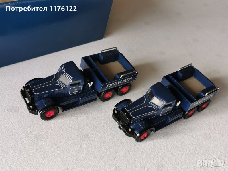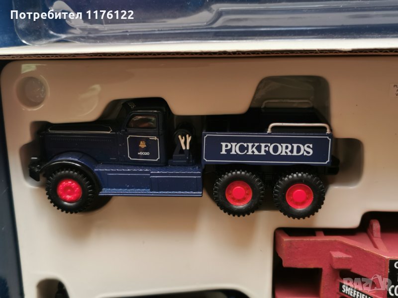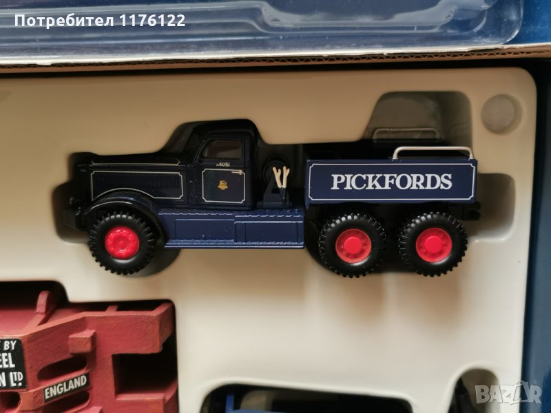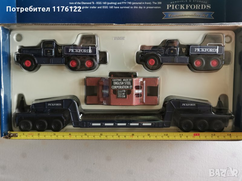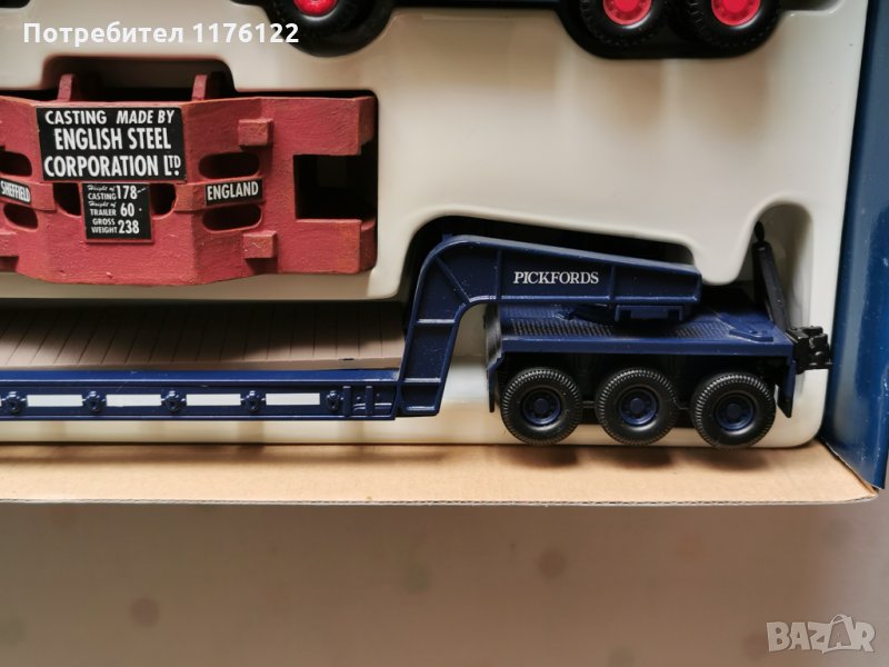 Много хубав сет с изцяло меални (развираемо и с някои пластмасови детайли и части) камиони, платформа и товар - комплекта тежи повече от 2 кг с кутията.