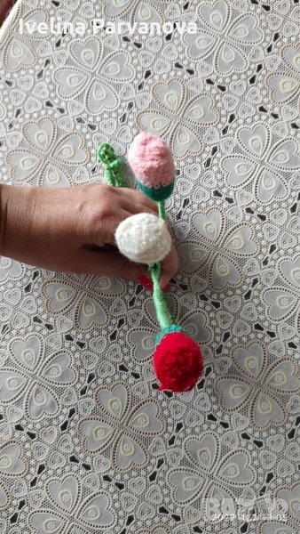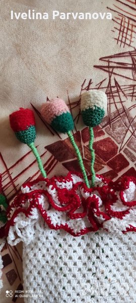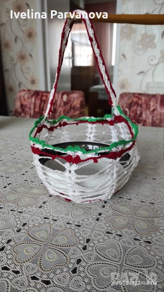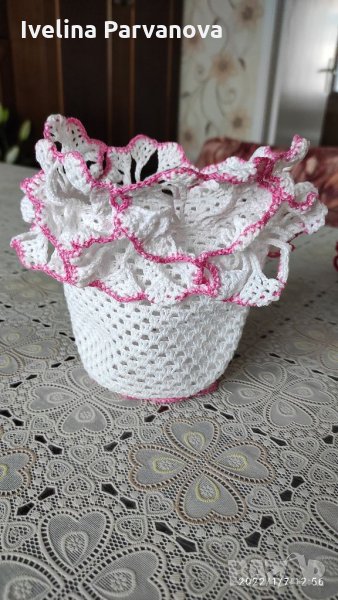 1 кошница и 2 вази плетени на една кука и към тях плетени цветя.Цената е за всичко.За да стоят прави като ваза(кошница) се колосват,поставя се буркан в тях,изпъва са плетивото и се оставя да изсъхне.Резултатът е изключително впечатляващ и красив продукт за декорация.По отделно- по споразумение.