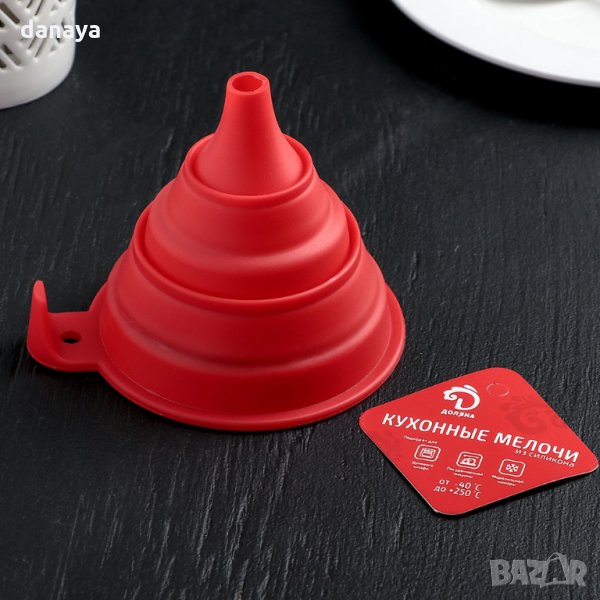 Сгъваема фуния от силикон за преливане на течности. Когато фунията е сгъната, не заема почти никакво място, което я прави много практичен кухненски помощник и не само. Вземете я със себе си, когато сте на къмпинг, планина, летуване, пикник.
