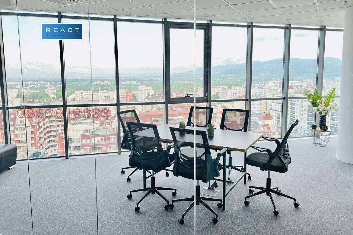 Обявената наемна цена е за необзаведен офис, без допълнително преградените помещения със стъкло. Може да бъде нает обзаведен или да се закупи наличното обзавеждане, чиято цена подлежи на договаряне.