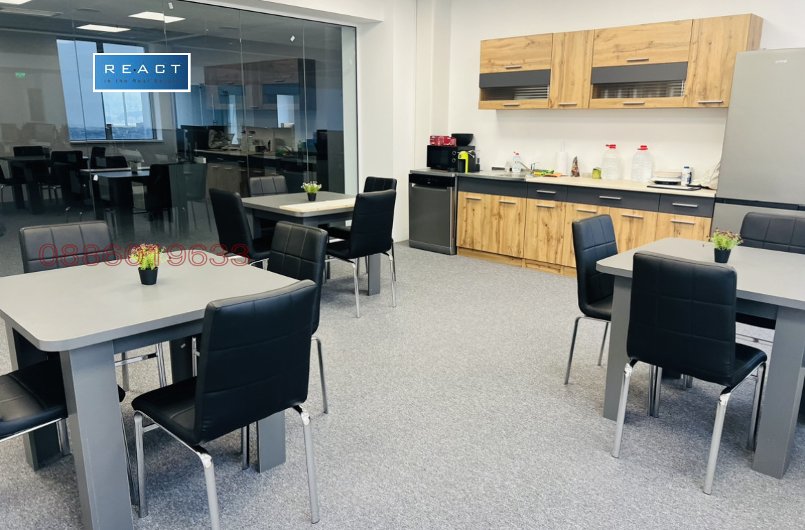 Разпределение: самостоятелен етаж, състоящ се от голямо тип Open space помещение( с възможност за допълнително преграждане), 4 самостоятелни работни помещения помещения, кухненски бокс, 4 wс, помещение за почивка.