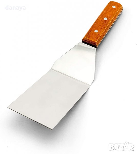 Кухненска ъглова шпатула за обръщане на продуктите върху барбекюто. Снабдена с къса дървена дръжка, превъзходно подходяща за обръщане на храна. Тази кухненска шпатула има широко приложение – използвай я като лопатка за торта, шпатула за сервиране на ястия, лопатка за изваждане на гореща храна от тавата и т.н