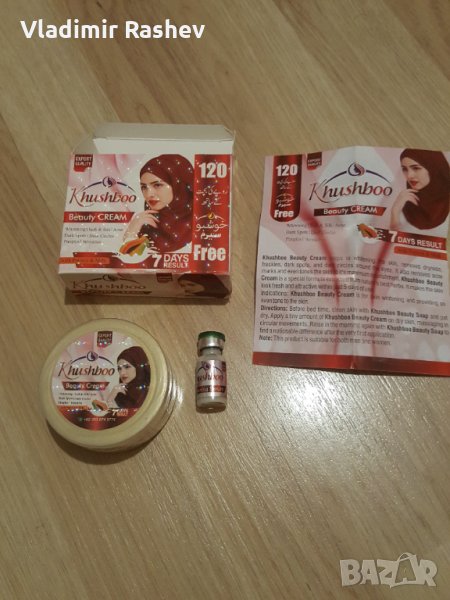Khushboo Beauty Cream помага за избелване на кожата, премахва сухота, лунички, тъмни петна и тъмни кръгове около очите. Той също така премахва следите от акне и дори тонизира кожата до максимално подхранване. Khushboo Beauty Cream е специална формула, извлечена от най-добрите билки в природата. Прави кожата да изглежда свежа и привлекателна само за 7 дни употреба.Показания > Khushboo Beauty Cream е за избелване на кожата и осигуряване на равномерен тон на кожата.Указания > Преди лягане почистете кожата със сапун за красота Sandal и я подсушете. Нанесете малко количество Khushboo Beauty Cream върху суха кожа, като масажирате с кръгови движения. Изплакнете сутринта отново със сапун за красота Sandal, за да откриете забележима разлика след първото нанасяне.Забележка > Този продукт е подходящ както за мъже, така и за жени.Серума може да се използва отделно нанасяйки се с памуче върху кожата. Или може да се прибави към крема, да се разбърка до постигането на хомогенна смес. По този начин прави крема още по - ефективен.Цена на комплекта (крема + серума) е 11 лв и 90 стотинки за брой. За количества на едро, предлагаме специални оферти. Изпращаме чрез Еконт или Спиди с опция за преглед. Куриерска услуга за сметка на клиента. Моля, разгледайте и другите ми обяви.