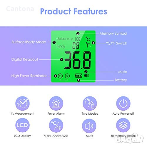 - Цифровият термометър за чело може да измерва температурата за 1 секунда без контакт. С акустична и визуална аларма за треска, тя може по-добре да следи телесната ви температура, можете също да изберете безшумен режим, ако не искате акустичната аларма.