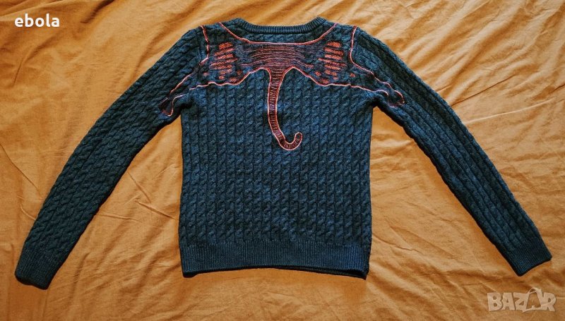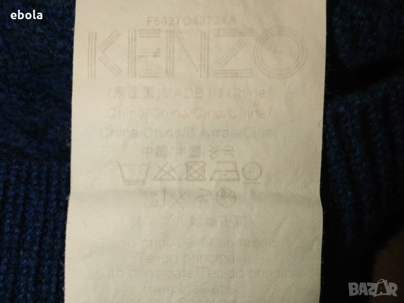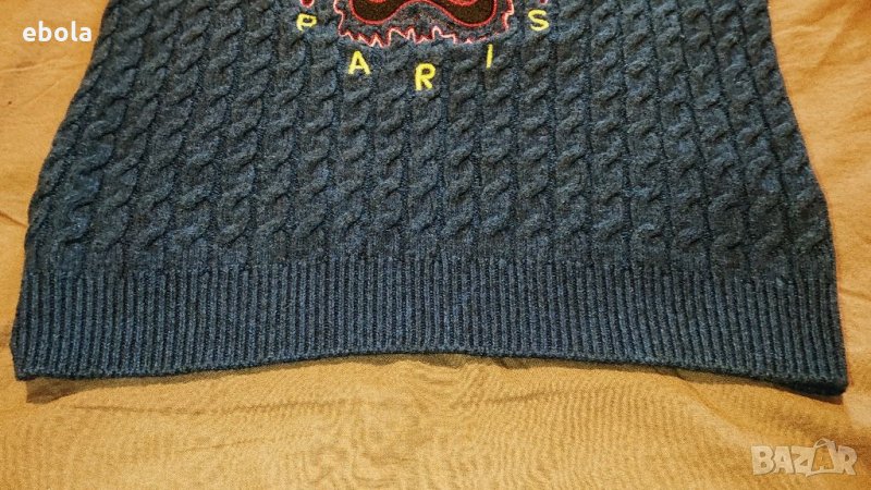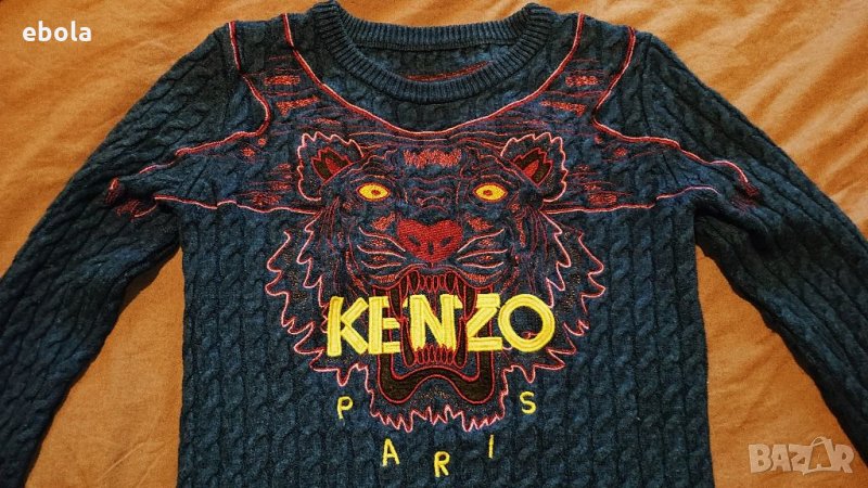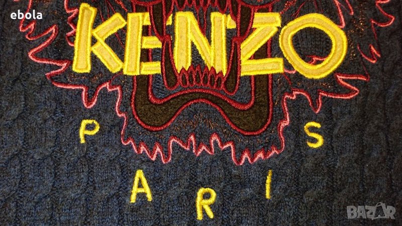 Пуловерът е оригинален, без никакви забележки. Размери: Между мищниците 40 см. От рамо до рамо 35 см. От рамото до долу 50 см. Ръкав от рамото 55 см. Пуловерът е плетен и поради тази причина разтеглив. Нов е на цена около и над 400 USD. Kenzo е френска луксозна модна къща, основана през 1970 г. от японския