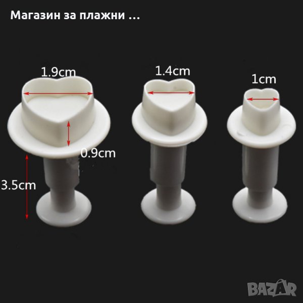 Комплект от 3 бр. пластмасови резци, идеален за приготвяне на красиви декорации на бисквити и сладки, торти и сладкиши. Комплектът съдържа 3 различни по големина пластмасови резци за тесто и фондан за направата на Сърца в три големини.