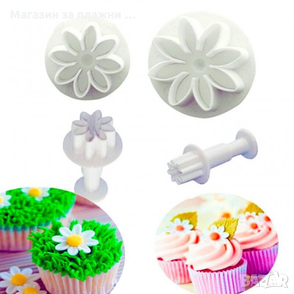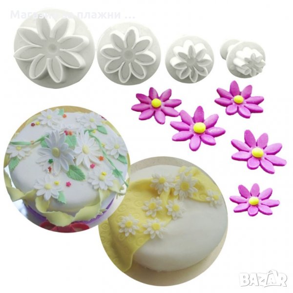 Резци за захарно тесто-фондан с бутало за поставяне върху торти и други сладкиши. Прекрасен комплект от 4 бр. резци за изрязване на цветя от фондан за декориране на торти. 4бр. различни размери форми с бутало и релеф - Маргаритки.