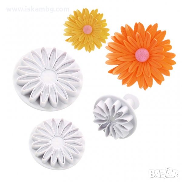 Този комплект съдържа три пластмасови резеца с избутващ механизъм за перфектни Маргаритки в три размера. Декорирайте сладкишите и празничните торти с ефектна триизмерна украса от големи и малки цветя с размери от 4,5; 5; 5,5 см. Почистват се лесно и са предназначени за многократна употреба.
