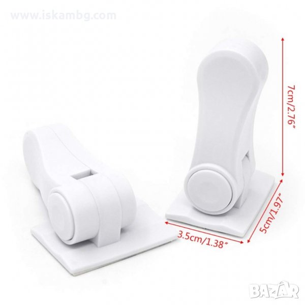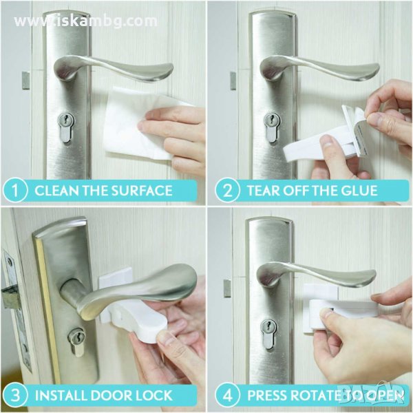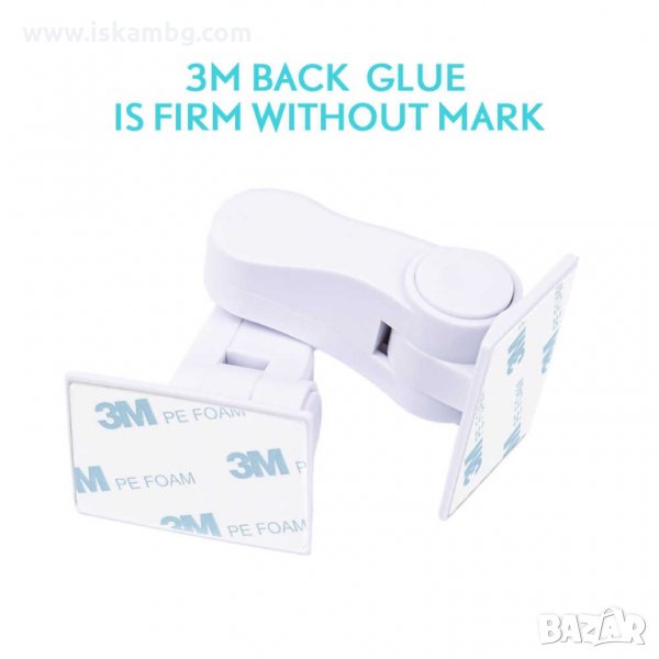 Устройството за заключване на шкаф, врата или прозорец е с бърз монтаж чрез 3М самозалепваща лепенка, която не оставя след от лепило при демонтаж.