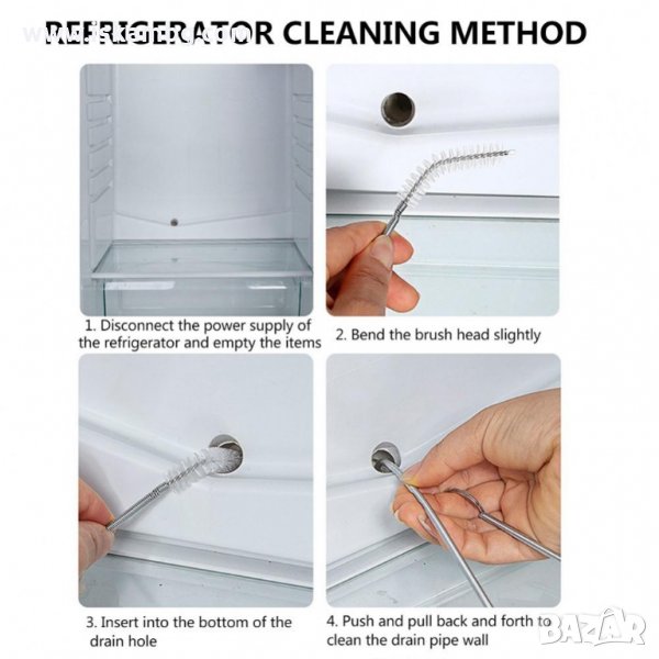 Гъвкавата конструкция позволява на уреда да достига до извити отвори с ъгъл до 90 градуса. Четката за отпушване на дренажни отвори, може да се използва освен за изпускателния отвор на хладилника и за достигане на други трудно достъпни каналчета в бита.