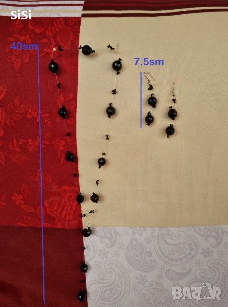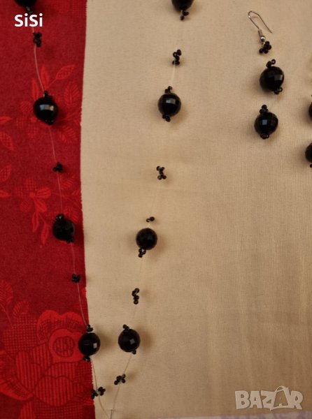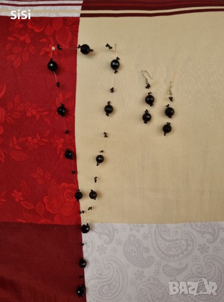 Колието е изработено с черни топченца на прозрачна нишка,като се сложи са видими само черните топчета не и нишката,което го прави да стои елегантно.Цената е за колието,налични са обеци към него.Цена за комплекта 15евро Дължина на колието и обеците е показана в снимка