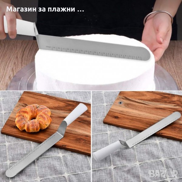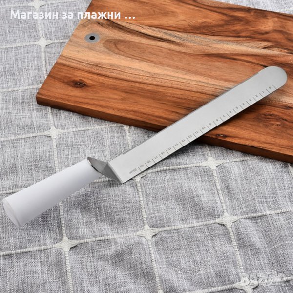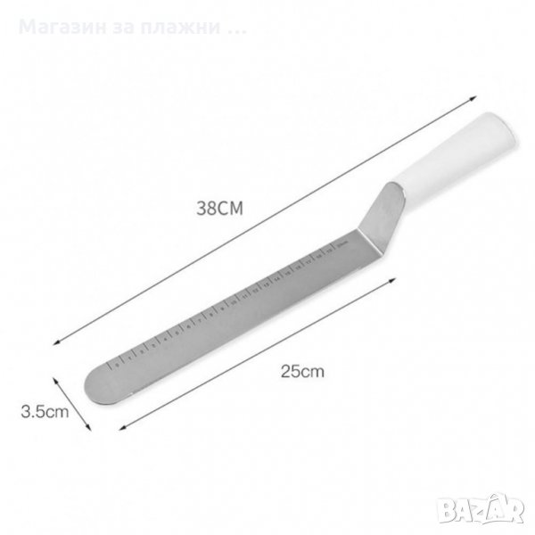 Подходяща е за разпределяне на глазури и кремове. Препоръчително е да се измие и подсуши добре преди употреба. Шпатулата е с размер 38 см, острието и е изработено от неръждаема стомана и е с дължина 25 см., оразмерено със скала до 20 см. Подходяща за почистване в съдомиялна машина.