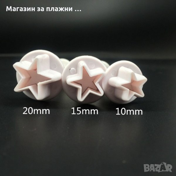 3 бр. различни размери резци с бутало за рязане и щамповане на фондан с форма на звезда. Подходящи за декорация на сладки или украсяване на торти и бисквити с фондан, захарно тесто или марципан.