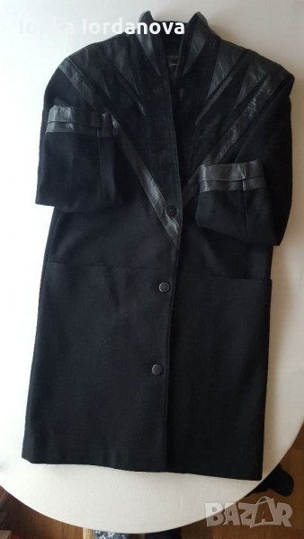 Елегантно палто от вълнен кашмир. Цвят-черен. Палтото е с елегантна линия-два джоба отпред, 3 копчета и 2 вътрешни. Отпред и на гърба е декорирано с ивици естествена кожа и естествен велур. Маншетите на ръкавите са също от естествена кожа.