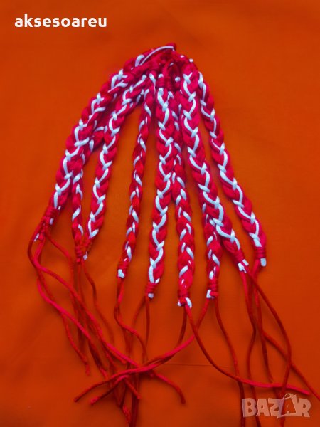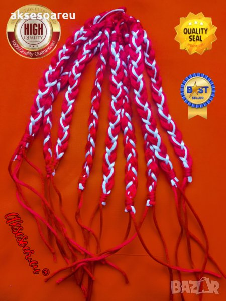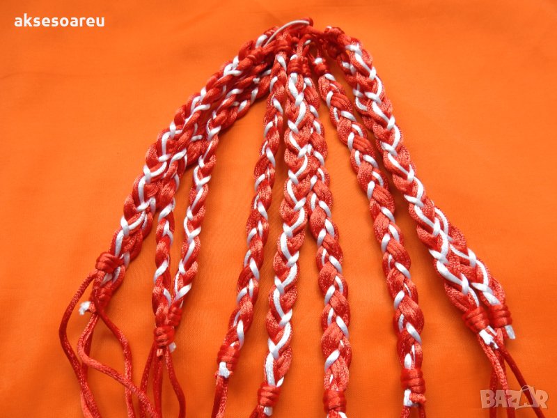 преплетени бели и червени конци и е разкрасено с червен и бял пискюл.