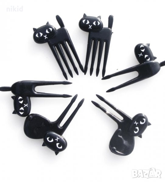 6 бр черна котка котки забавни клечки топери за забождане на хапки мъфини плодове вилички парти → Обява 35419133