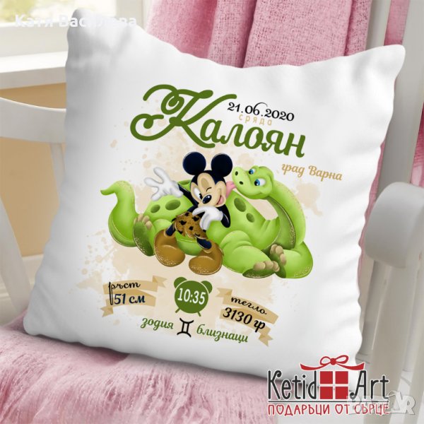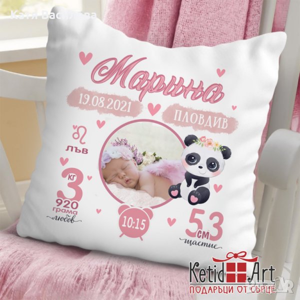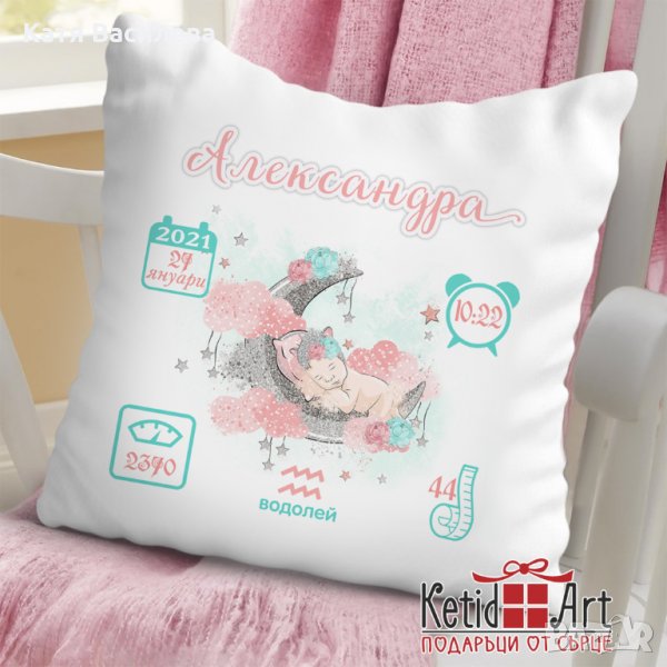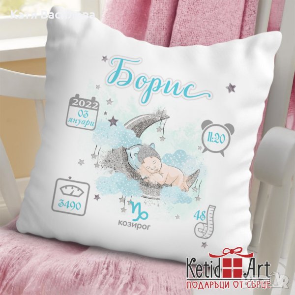 Възглавничката включва: включително неговото име, дата и час на раждане, размери, тегло и зодиакален знак.