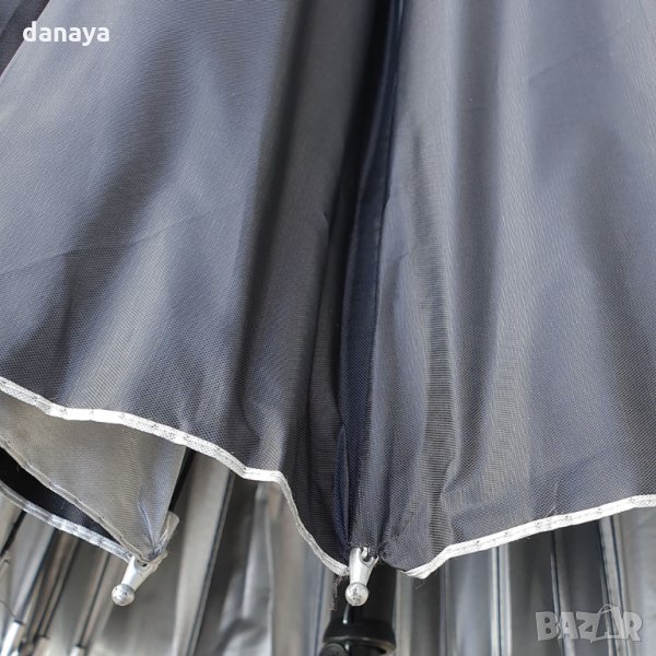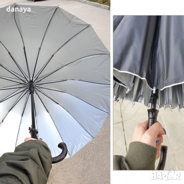 Черен класически чадър за дъжд, със здрава полиестерна промазка. Външната част е в черен цвят, а от вътре е в лъскаво сиво. Здрави 16 броя спици. Чадърът има дръжка тип бастун.
