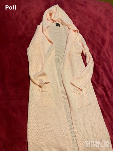 Дълга плетена жилетка в бебешко розаво. С качулка и джобчета. Нова.