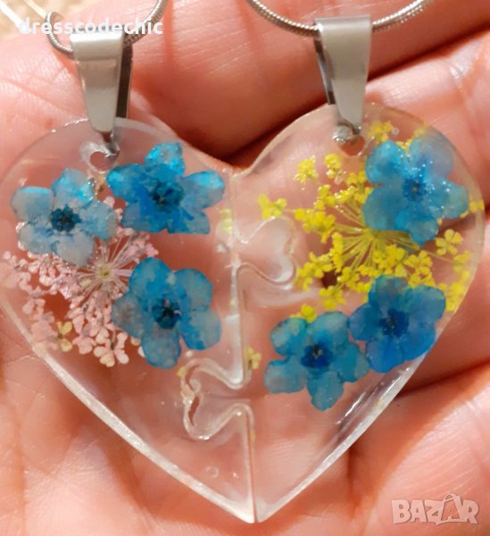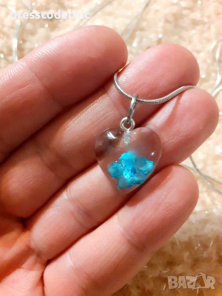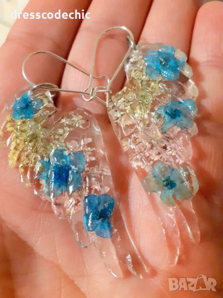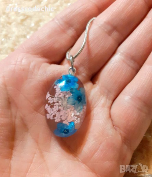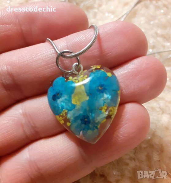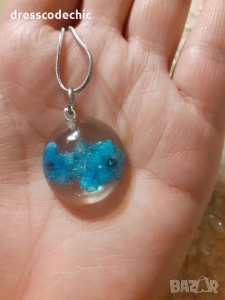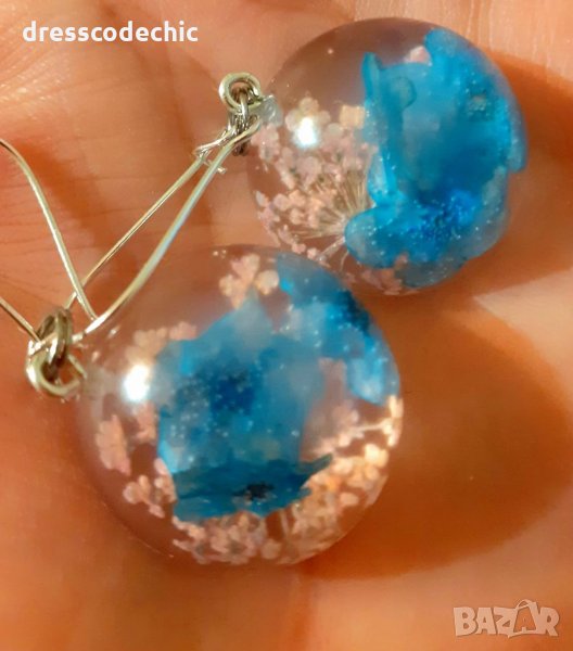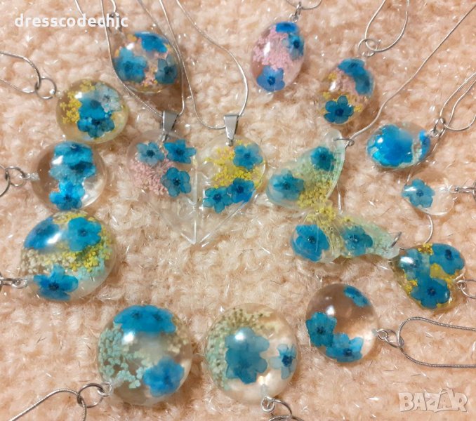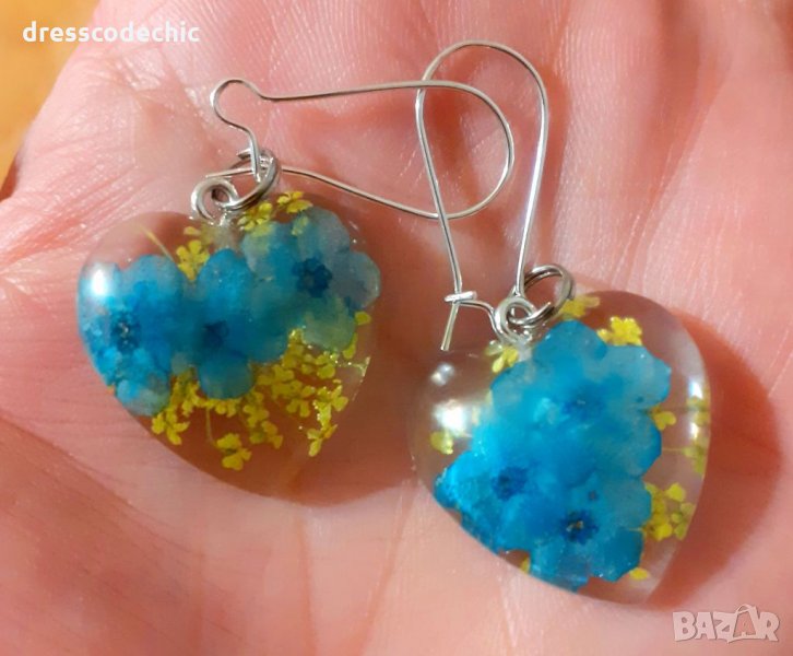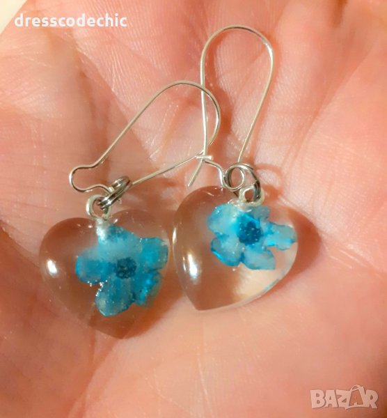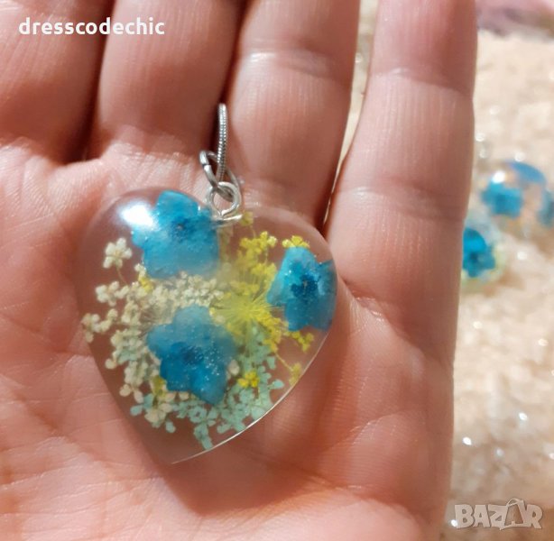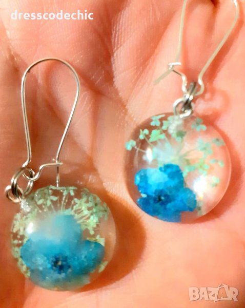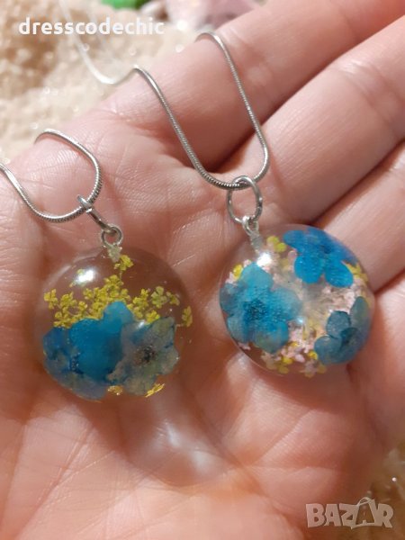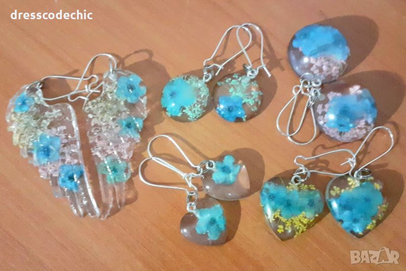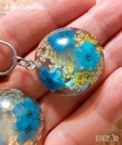 Колиета и обеци от бижутерска смола и истиндки цветя Незабравки.