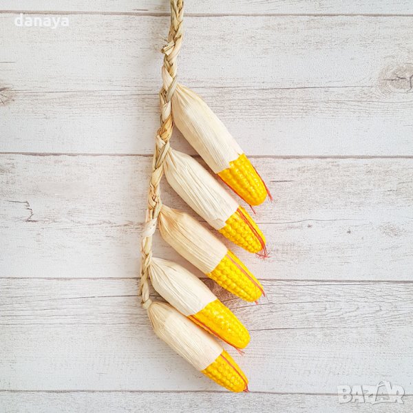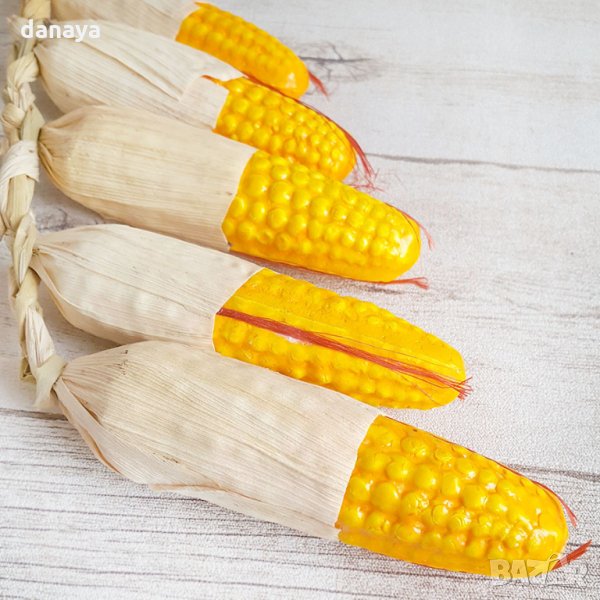 Реалистична изкуствена царевица, изплетена на връзка от 5 броя кочани. Тази декоративна връзка царевица е чудесна за декор и украса в битов кът, кухня, декориране на заведения, магазини и всякакъв тип помещения. Ръчна изработка.