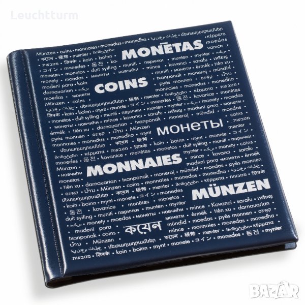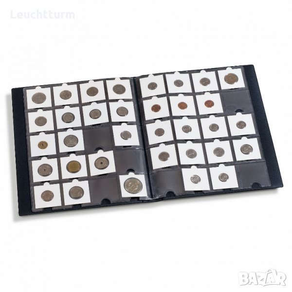 класьор, в син цвят, с 10 листа с по 20 отделения за монети в самозалепващи се картонени рамки/картончета/ формат 50x50 mm.