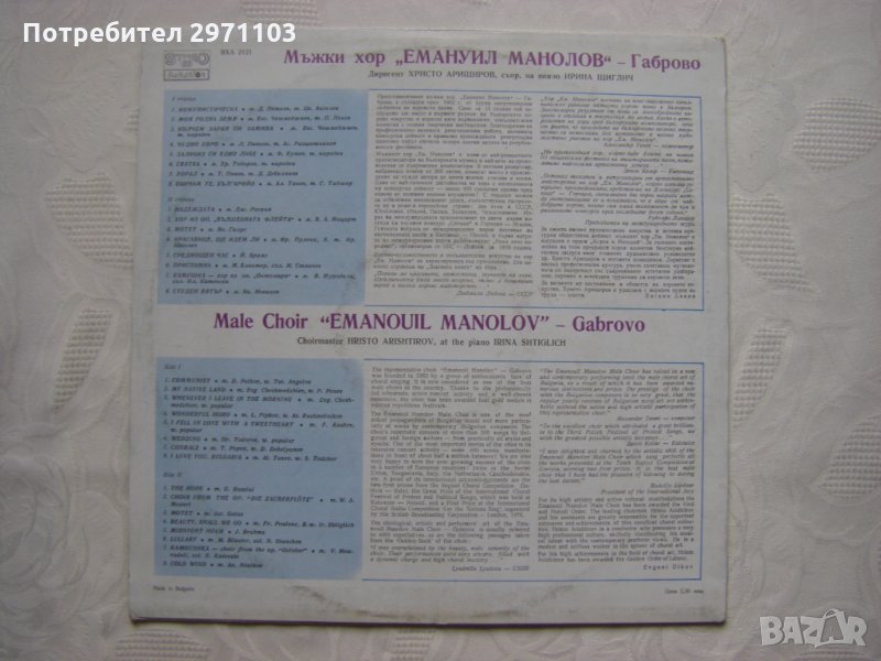 Грамофонна плоча - ВХА 2121 - Мъжки хор "Емануил Манолов" - Габрово, диригент Христо Арищиров; съпровожда на пиано Ирина Щиглич