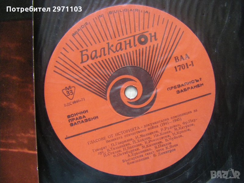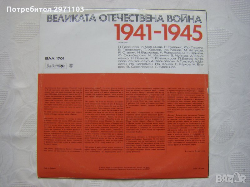 Грамофонна плоча - ВАА 1701 - Веселин Димитров. Гласове от историята: документална композиция за Великата отечествена война 1941-1945; бълг. текст чете Кирил Янев
