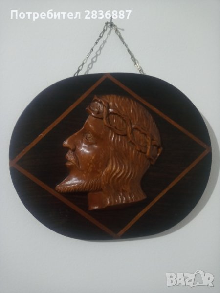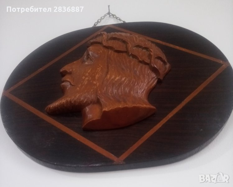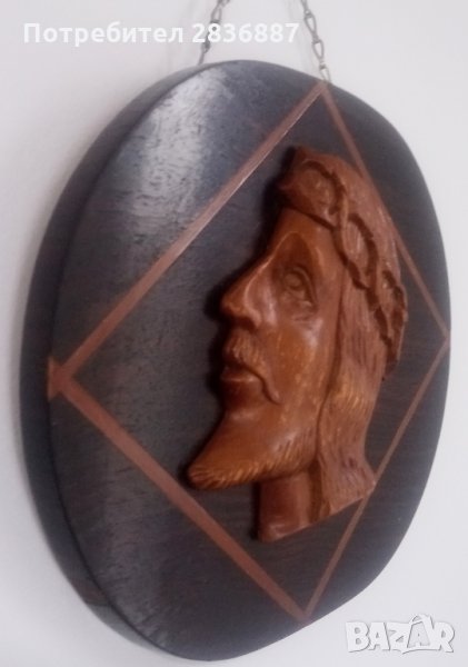 дърворезба религиозна плоча за стена. Плочата има вътрешна рамка във формата на ромб с по светло дърво с цвета на дърворезбованата глава с лавровия венец на Христос. Добро състояние.Ако имате въпроси относно плочата, не се колебайте да попитате. Ще направя всичко възможно да ви помогна.