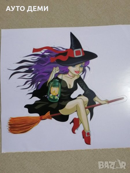Продавам цветни винилови стикери с изображение на вещица с летяща метла .
