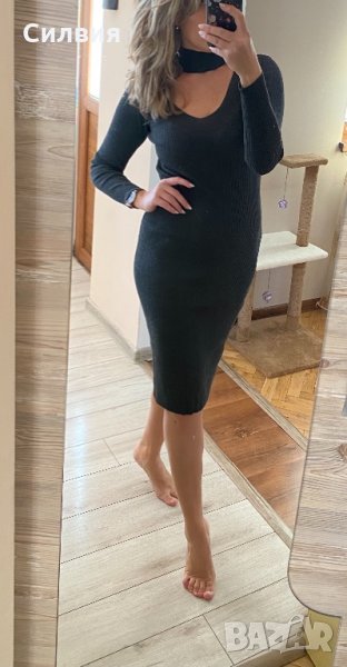 Роклята е тъмно сива на цвят, с изрязано деколте (чокър). Силно еластична, рипсена материя. Доста е плътна. Няма забележки.