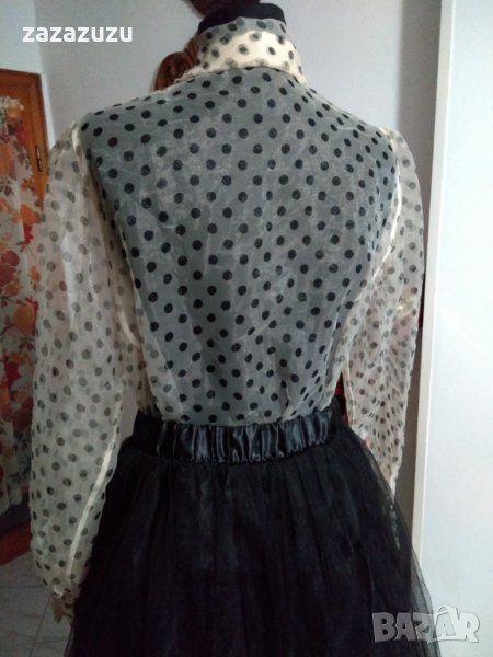 ZARA официална дамска блуза цвят пудра на черни точки от шифон с дълъг ръкав, с маншет, с копчета отпред до долу, гръб прозрачен, а отпред е с подплата. Блузата е много красива, нова, не номентирам цената. Дължина на ръкава 65см., от тила до долу 65см., гръдна обиколка 105см., отпред подплатата е от естествена коприна за по-голям комфорт при носене.