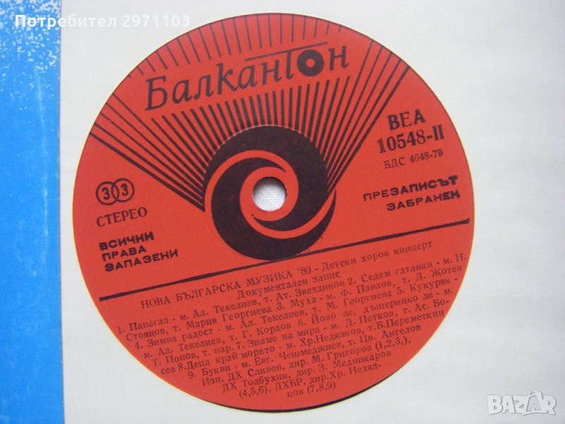 Всички земни посоки / П. Ступел; текст Р. Василев; изпълнява детски хор Сливен, диригент М. Григоров. Детска фестивална / К. Стефанов; текст Ас. Босев. Златна вечер / Д. Добрев; текст Д. Бозаков. Летим със самолет / Ал. Текелиев; текст В. Русчева. Нападение; На пързалката / П. Стоянов; текст Ст. Арабаджиев; изпълнява детски хор Орфей, диригент Б. Боев. Валякът Тъпчо / Здр. Манолов; текст М. Ганчев. Кирчо пред съда / Ал. Танев; текст Ас. Босев; изпълнява детски хор Ямбол, диригент Ст. Пастърмаджиева. Папагал / Ал. Текелиев; текст Ат. Звездинов. 7 гатанки / П. Стоянов; текст М. Георгиева. Муха / Ф. Павлов; текст Д. Жотев; изпълнява детски хор Сливен, диригент М. Григоров. Зимна радост / Ал. Текелиев; текст М. Георгиева. Кукуряк / текст Г. Кордов. Йово ле, дъщеринко ле: текст народен / Т. Попов; изпълнява детски хор Толбухин, диригент З. Медникаров. Знаме на мира / Д. Петков; текст Ас. Босев. Деца край морето / Хр. Недялков; текст Б. Переметкин. Букви / Е. Чешмеджиев; текст Цв. Ангелов; изпълнява Детски хор при Българското радио, диригент Хр. Недялков