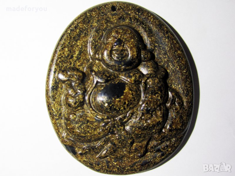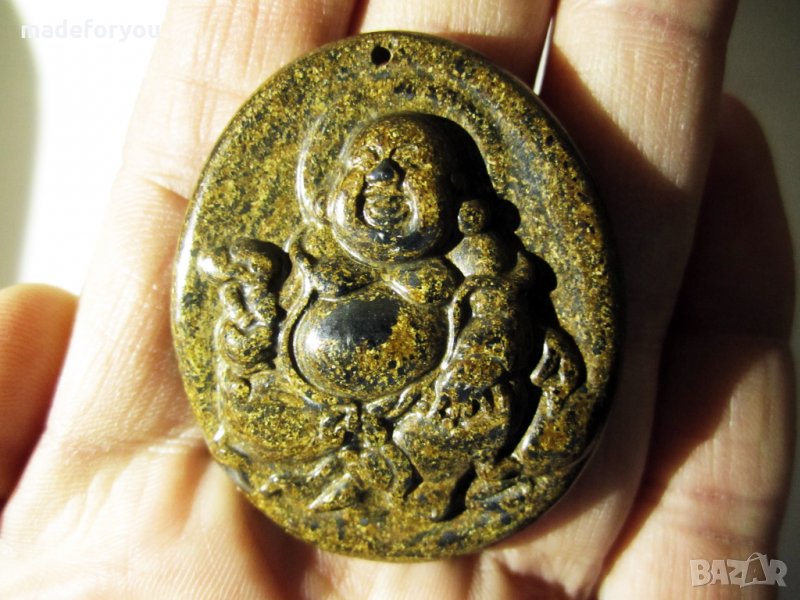 Великолепно оформен медальон, висулка на смеещият се буда от естествен натурален, природен бронзит , ръчно гравиран , страна на произход Индия размери 46 х 38 мм. Тегло 136.25 карата.